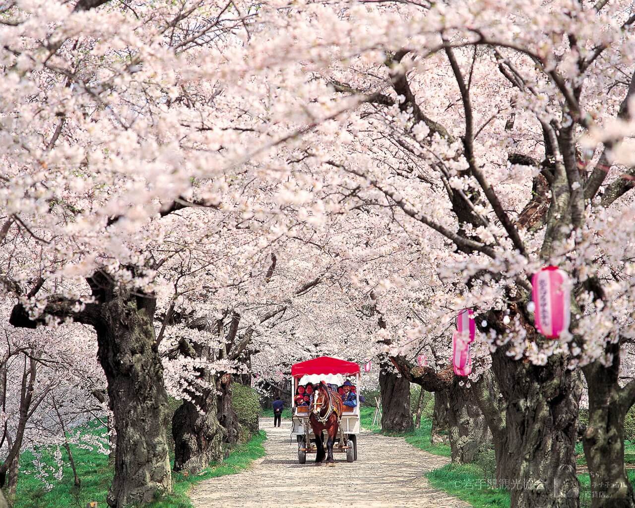 Một trong ba địa điểm ngắm hoa anh đào Michinoku vô cùng đẹp. Dọc bờ sông Kitakami có tới khoảng 10,000 cây anh đào tạo thành một đường hầm dài 2km. Khung cảnh vô cùng ngoạn mục. Du khách có thể ngắm hoa trên một cỗ xe ngựa kéo tự thuê để thưởng trọn cảnh đẹp của hoa đào này.