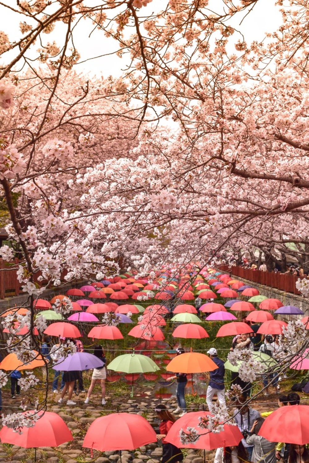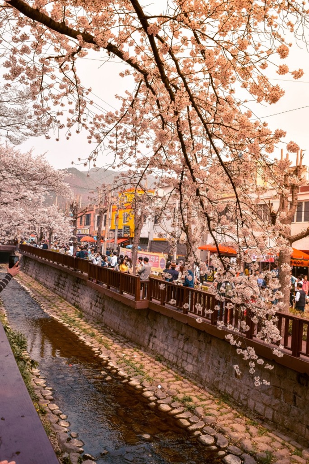 Mùa xuân ở Hàn Quốc mang đến làn gió mát và hàng loạt hoa đào nở hoa ở khắp Hàn Quốc. 1 trong những lễ hội xuân nổi bật nhất là Lễ Hội Hoa Anh Đào Jinhae, với 2 khu vực nổi tiếng, Yeojwacheon (Cầu Lãng Mạn) và Ga Gyeonghwa.